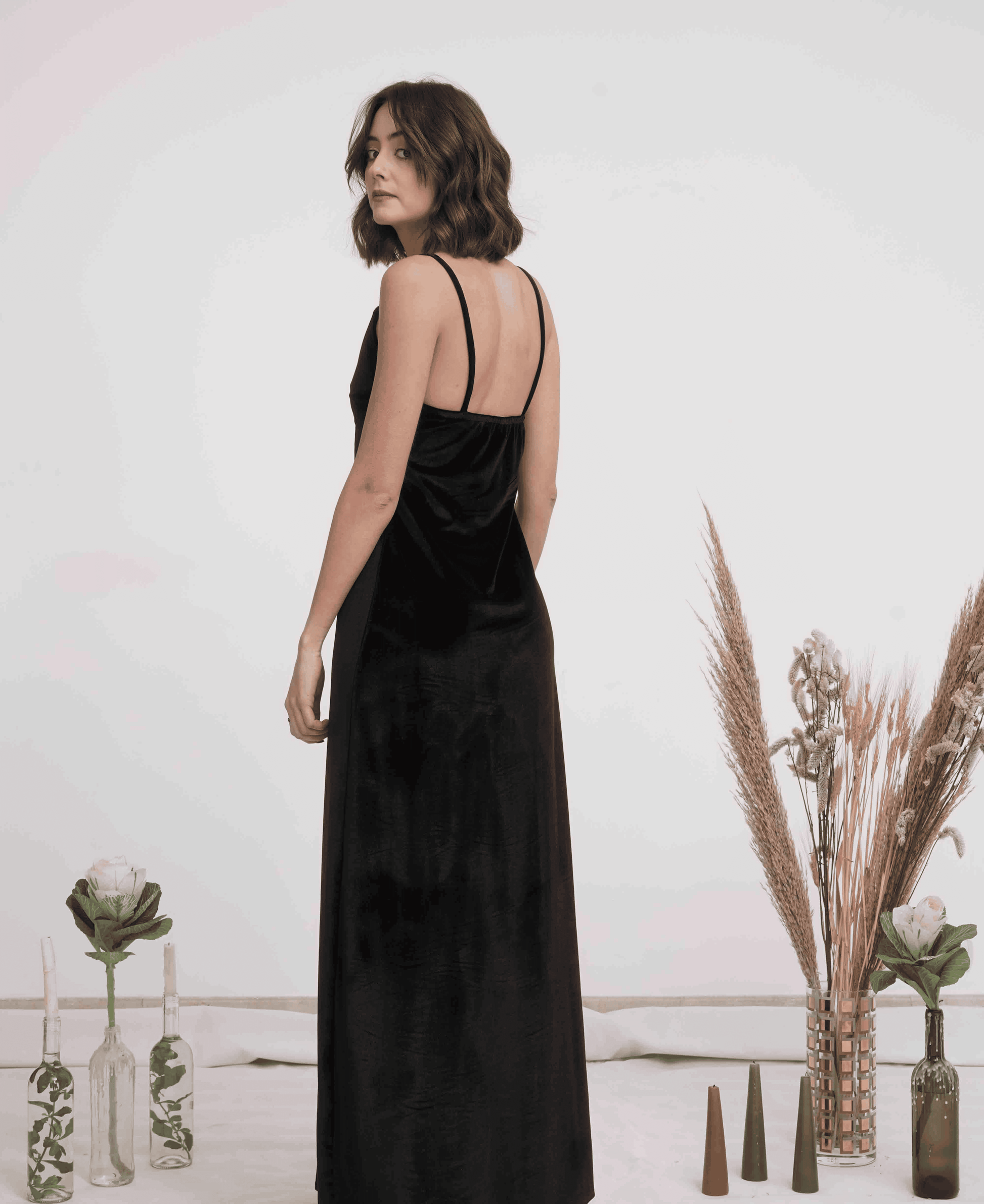 Elevate your style with our long black classic silk dress.
